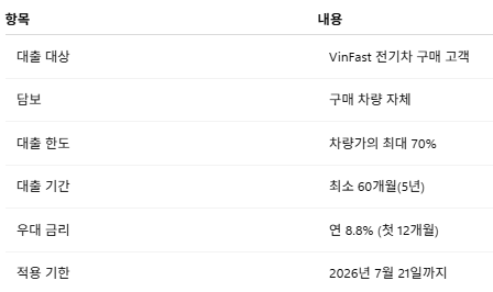 특히 이번 상품은 베트남 전기차 1위 브랜드 VinFast 차량 구매자를 대상으로 합니다.